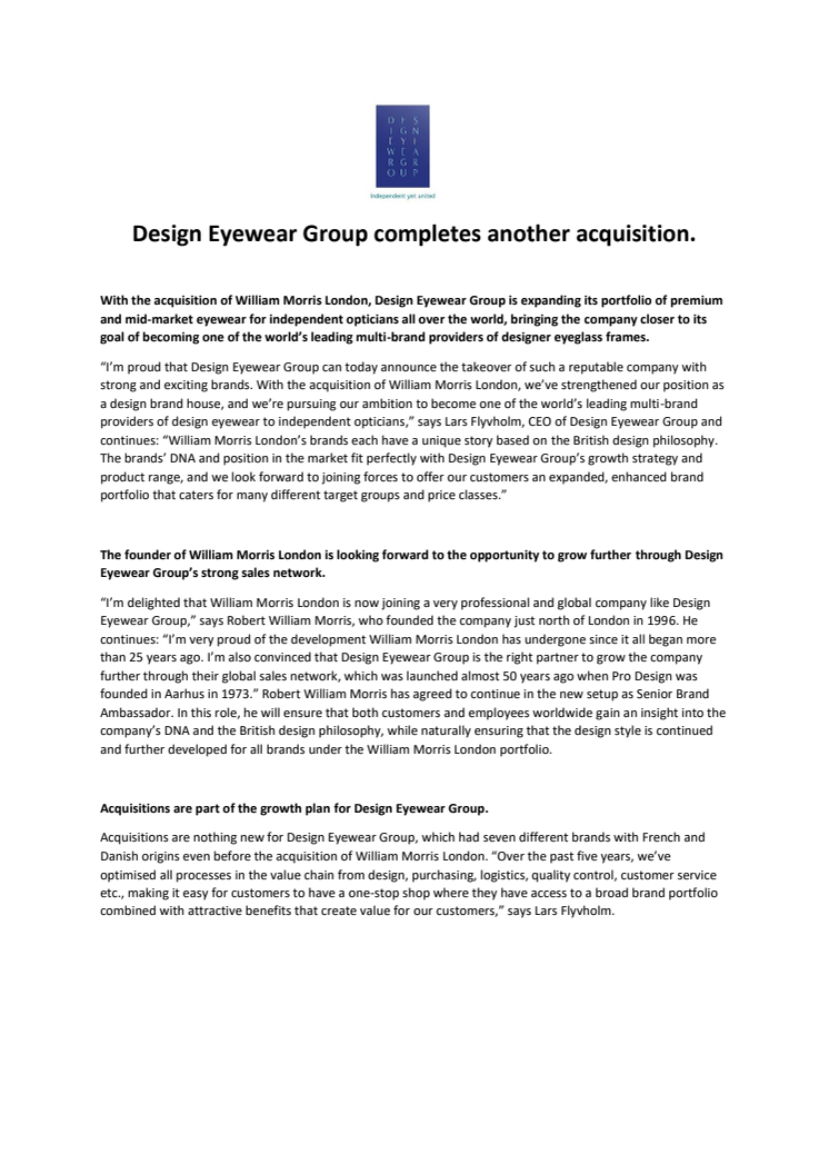 DESIGN EYEWEAR GROUP COMPLETES ANOTHER ACQUISITION