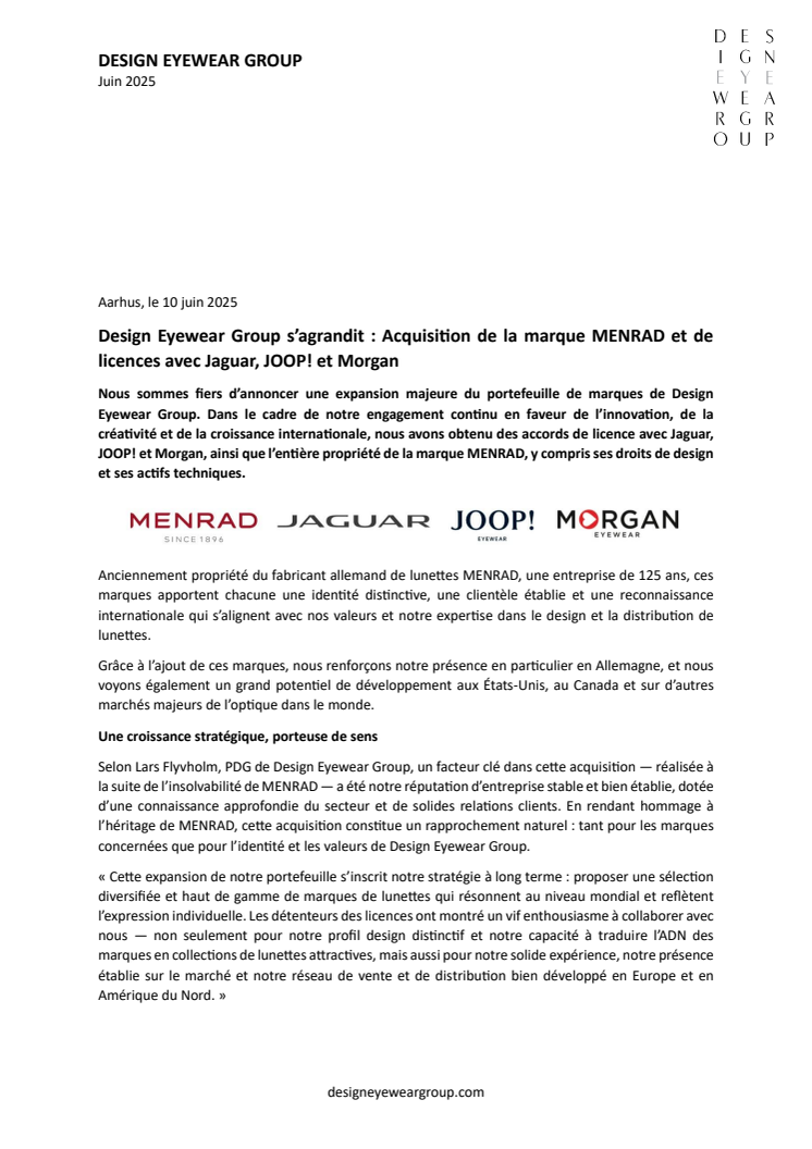 Design Eyewear Group s’agrandit : acquisition de la marque MENRAD et de licences avec Jaguar, JOOP! et Morgan