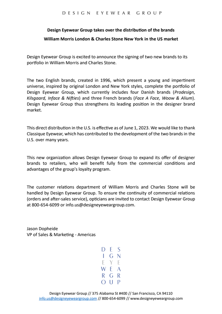 Design Eyewear Group takes over the distribution of the brands William Morris London & Charles Stone New York in the US market