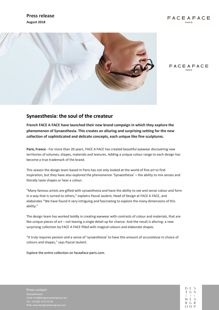 French FACE A FACE have launched their new brand campaign in which they explore the phenomenon of Synaesthesia. This creates an alluring and surprising setting for the new collection of sophisticated and delicate concepts, each unique like fine sculptures.