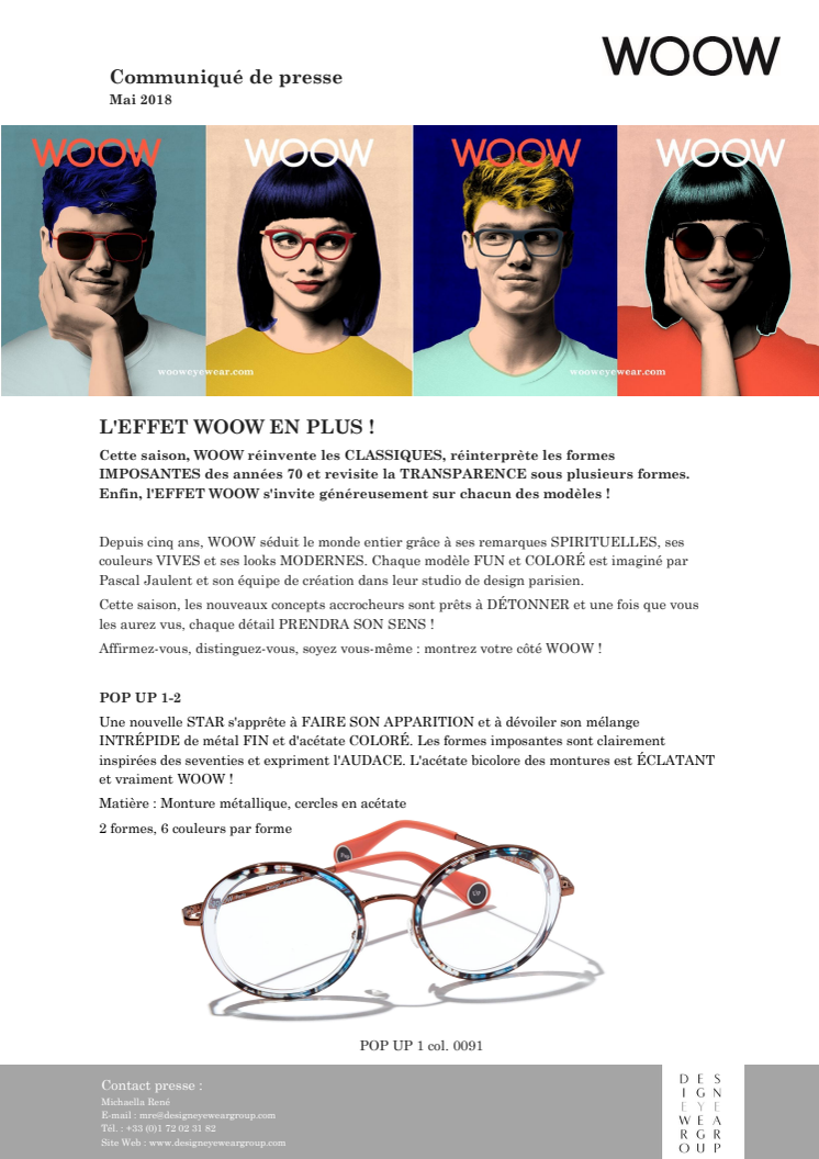 Cette saison, WOOW réinvente les CLASSIQUES, réinterprète les formes IMPOSANTES des années 70 et revisite la TRANSPARENCE sous plusieurs formes. Enfin, l'EFFET WOOW s'invite généreusement sur chacun des modèles !
