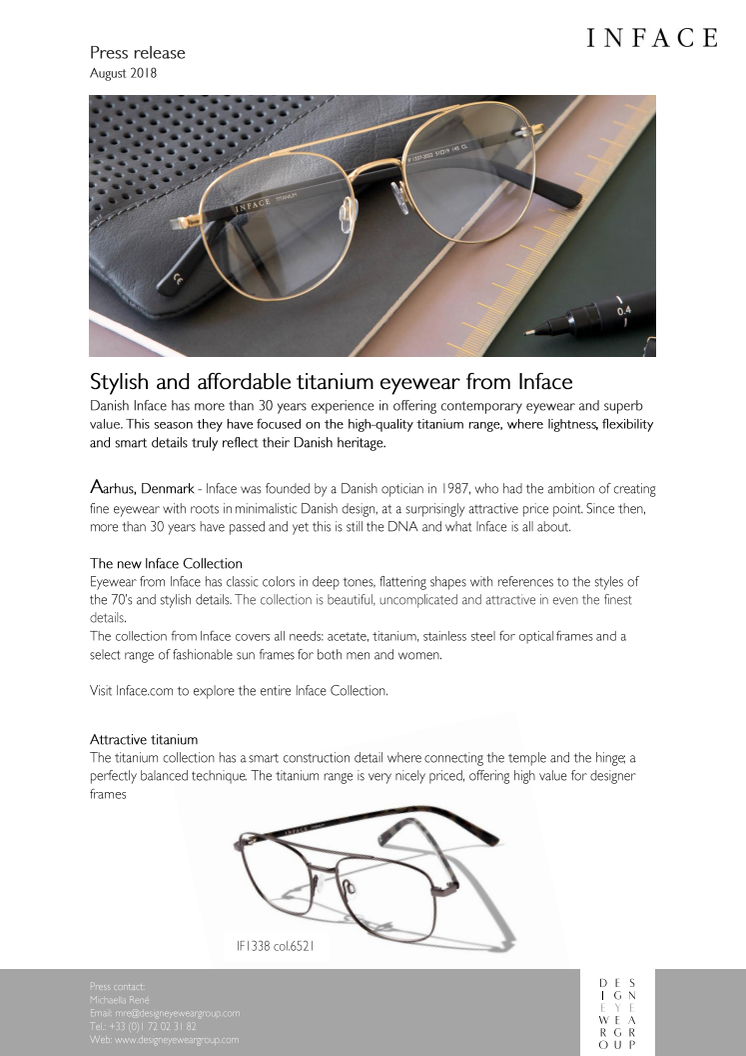 Eyewear from Inface has classic colors in deep tones, flattering shapes with references to the styles of the 70’s and stylish details. The collection is beautiful, uncomplicated and attractive in even the finest details.
