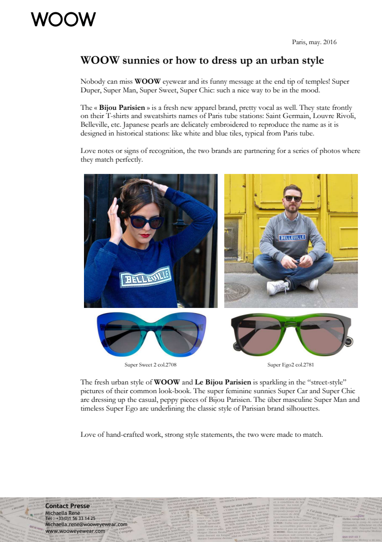 The fresh urban style of WOOW and Le Bijou Parisien is sparkling in the “street-style” pictures of their common look-book. The super feminine sunnies Super Car and Super Chic are dressing up the casual, peppy pieces of Bijou Parisien. The über masculine Super Man and timeless Super Ego are underlining the classic style of Parisian brand silhouettes.